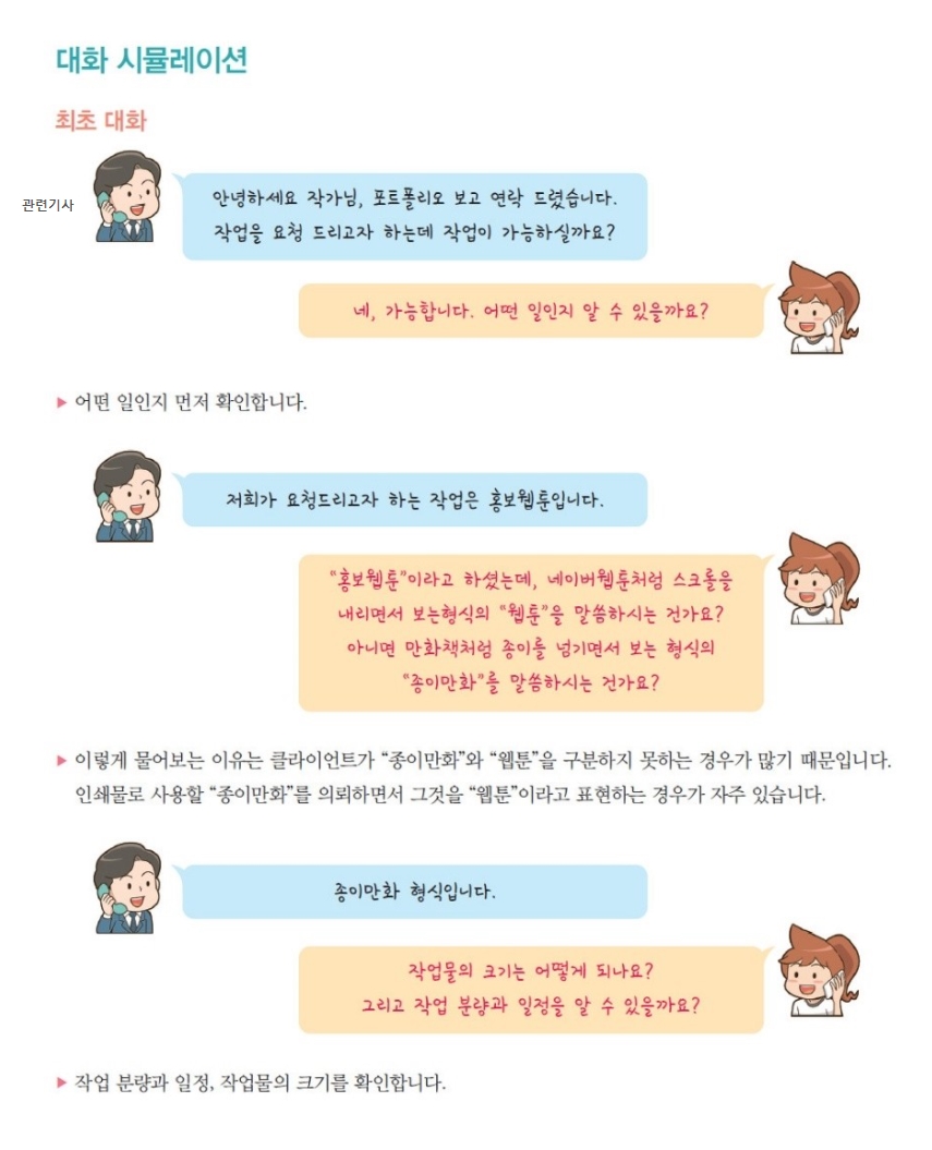 제가 제일 흥미롭게 봤던 건 이 이후 챕터부터였습니다. 이 이후 챕터부터 '어시스트'와 '프리랜서' 두책의 내용이 꽤 갈리기 때문입니다. 특히 제가 제일 재밌게 봤던 부분은 커뮤니케이션 부분입니다. '프리랜서'에서는 일을 맡았을 때 담당자와 어떻게 커뮤니케이션을 하는지에 대해 아래 그림처럼 여러 상황에 맞춰 어떤 식의 대화가 오고가며 어떤 말을 해야 하는지에 대해 상당히 자세히 적혀있습니다. 그리고 내용이 확실히 외주 실무에서 겪을 법한 상황극이어서 공감이 많이 갔습니다.