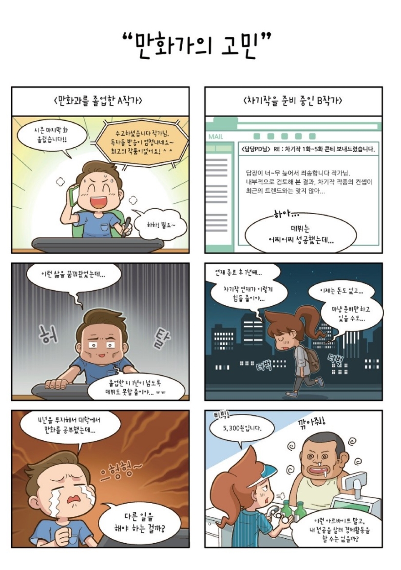많은 지망생분들, 현업 만화가분들이 모두 비슷한 고민을 하고 있을 것입니다. 어릴 때부터 만화가 좋아 일을 시작했지만 데뷔는 어렵고 데뷔를 하더라도 최상위의 일부 작가들 외에 대부분의 나머지 작가들을 생각보다 생계에 아주 큰 어려움을 겪을 수 밖에 없는 현실에 대한 고민 말입니다. 저도 똑같이 했던 고민이고 그 대안을 찾아 지금은 프리랜서 어시스트가 되어 제가 좋아하는 그림 그리는 일로 만족스럽게 생계를 이어나가고 있습니다.